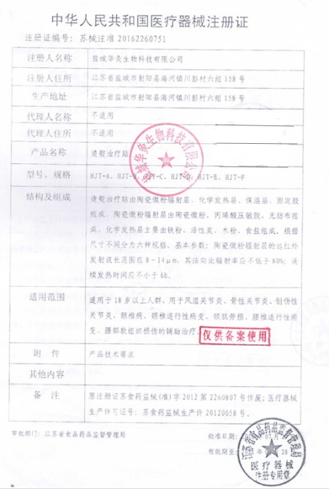 蘇食藥監(jiān)械(準(zhǔn))字2012第2260807號(hào)/鹽城華灸生物科技有限公司 有效期至:2016-10-31燙熨治療貼