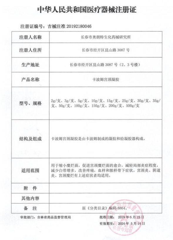 吉械注準20232180222/吉林省國大生物制藥有限公司 有效期至:2028-03-30卡波姆宮頸凝膠
