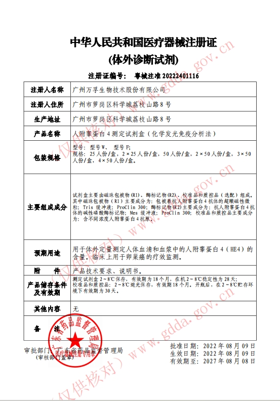 粵械注準(zhǔn)20222400539/深圳邁瑞生物醫(yī)療電子股份有限公司 有效期至:2028-04-19人附睪蛋白4測定試劑盒(化學(xué)發(fā)光免疫分析法)