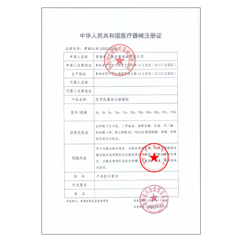 晉械注準(zhǔn)20252140130/星禾藥業(yè)(山西)集團(tuán)有限公司 有效期至:2030-07-22醫(yī)用抗鼻腔過(guò)敏凝膠