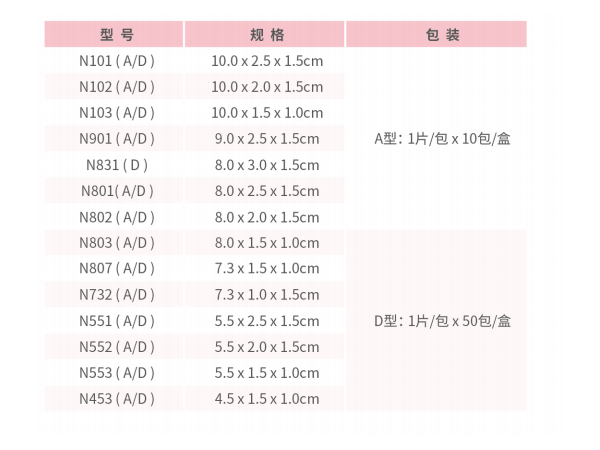凝膠型(A型,帶單層紗條):N101A、N102A、N103A、N801A、N802A、N803A、N551A、N552A、N553A、N901A、N807A、N732A、N453A;凝膠增強(qiáng)型(B型,帶雙層紗條):N101B、N102B、N801B、N802B、N552B;不帶紗條加強(qiáng)型(C型):N801C、N802C、N552C;不帶紗條普通型(D型):N801D、N802D、N552D、N101D、N102D、N103D、N901D、N803D、N807D、N831D、N732D、N551D、N553D、N453D