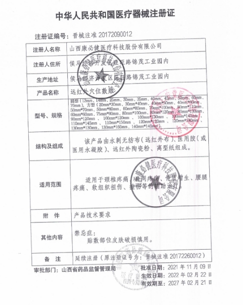 晉械注準(zhǔn)20172260118/山西健康動(dòng)力醫(yī)療科技有限公司 有效期至:2022-12-12遠(yuǎn)紅外穴位敷貼
