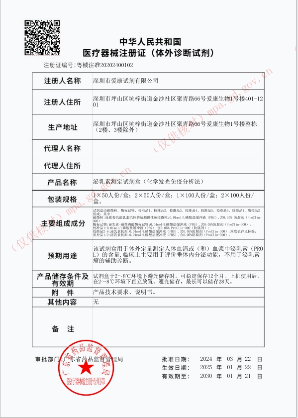 蘇械注準(zhǔn)20192401098/南京仁邁生物科技有限公司 有效期至:2029-09-08泌乳素測定試劑盒(化學(xué)發(fā)光免疫分析法)