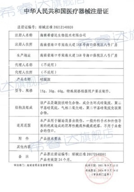 瓊械注準20172640001/海南希睿達生物技術(shù)有限公司 有效期至:2022-03-15硅凝膠