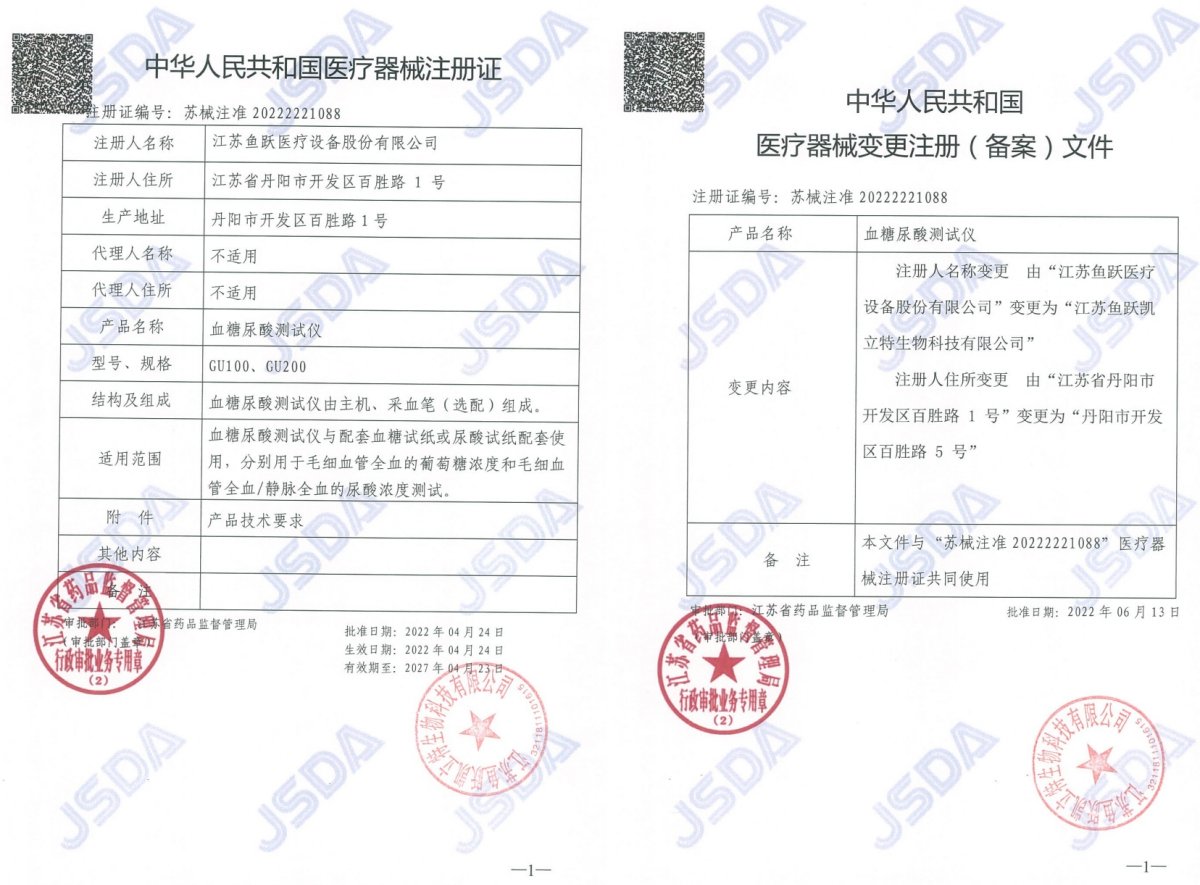 蘇械注準(zhǔn)20252222349/江蘇魚躍凱立特生物科技有限公司 有效期至:2030-12-17血糖尿酸測試儀