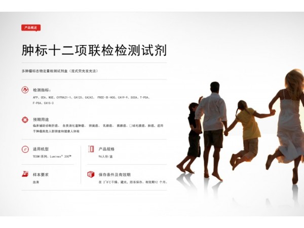 本產(chǎn)品用于體外定量檢測人血清中7種腫瘤標(biāo)志物:AFP、CA125、CYFRA21-1、CA24-2、CEA、free-β-hCG、NSE的濃度。主要用于對惡性腫瘤患者進(jìn)行動(dòng)態(tài)監(jiān)測以輔助判斷疾病進(jìn)程或治療效果,不能作為惡性腫瘤早期診斷或確診的依據(jù),不能用于普通人群的腫瘤篩查。