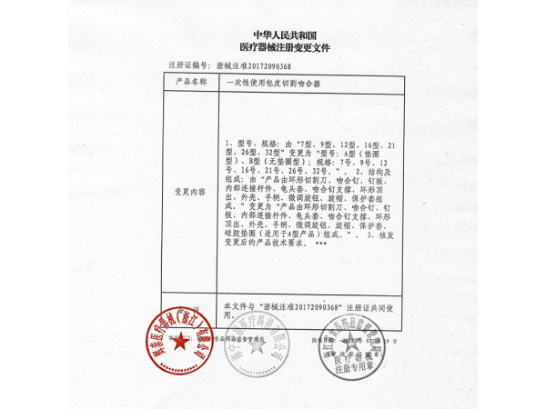 粵械注準(zhǔn)20172090907/廣東省雙靈藥業(yè)有限公司 有效期至:2022-05-30一次性使用包皮切割吻合器