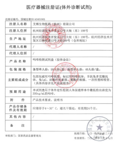 國械注準(zhǔn)20163400898/北京萬泰生物藥業(yè)股份有限公司 有效期至:2026-03-29嗎啡檢測試劑盒(膠體金法)