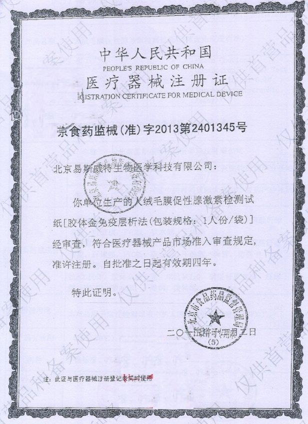 京藥監(jiān)械(準(zhǔn))字2009第2400781號/北京易斯威特生物醫(yī)學(xué)科技有限公司 有效期至:2013-10-08人絨毛膜促性腺激素檢測試紙(膠體金免疫層析法)
