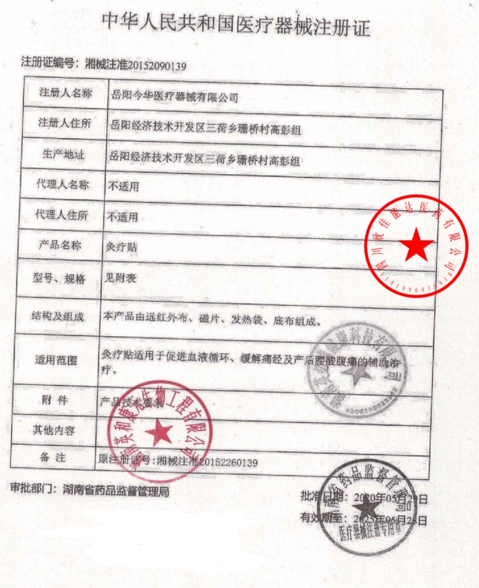 湘械注準(zhǔn)20152260139/岳陽今華醫(yī)療器械有限公司 有效期至:2020-09-20灸療貼