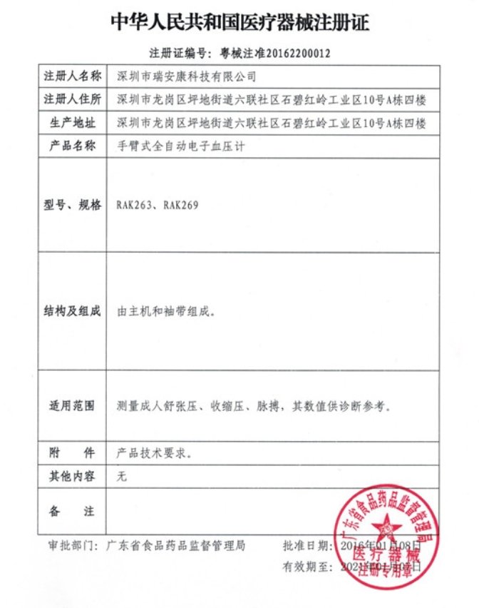 粵械注準(zhǔn)20162070012/深圳市瑞安康科技有限公司 有效期至:2025-11-29手臂式全自動(dòng)電子血壓計(jì)