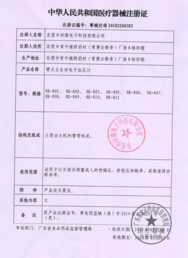 粵食藥監(jiān)械(準(zhǔn))字2014第2200293號(更)/東莞市好康電子科技有限公司 有效期至:2018-03-13臂式全自動電子血壓計(jì)