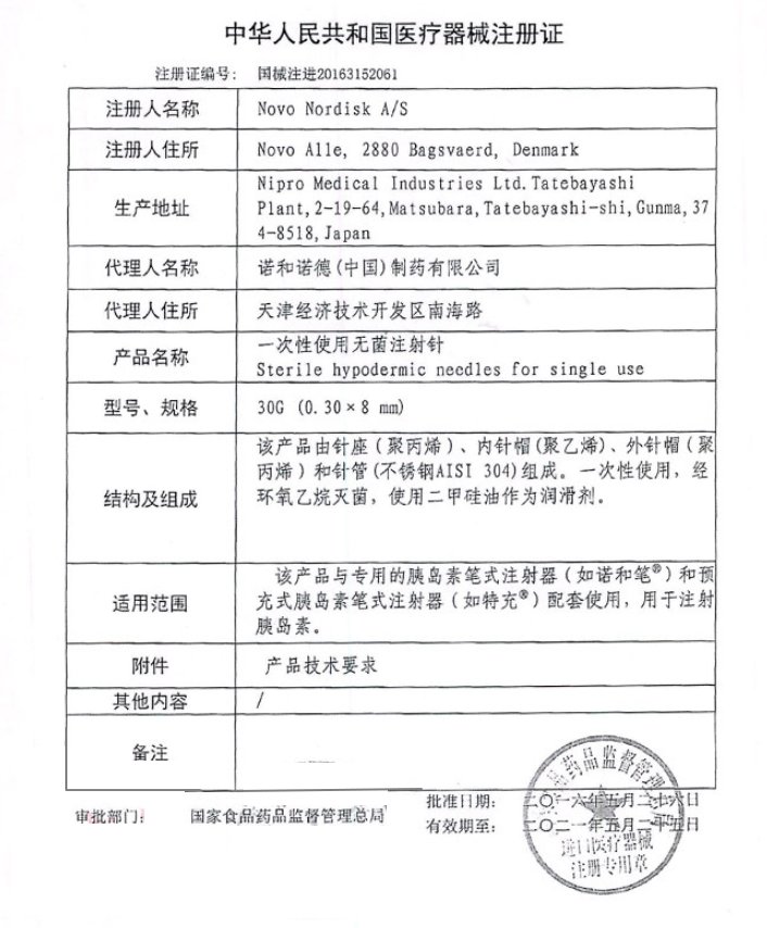 國食藥監(jiān)械(進(jìn))字2014第3154569號/NanoPass Technologies Ltd. 有效期至:2018-09-29一次性使用無菌注射針