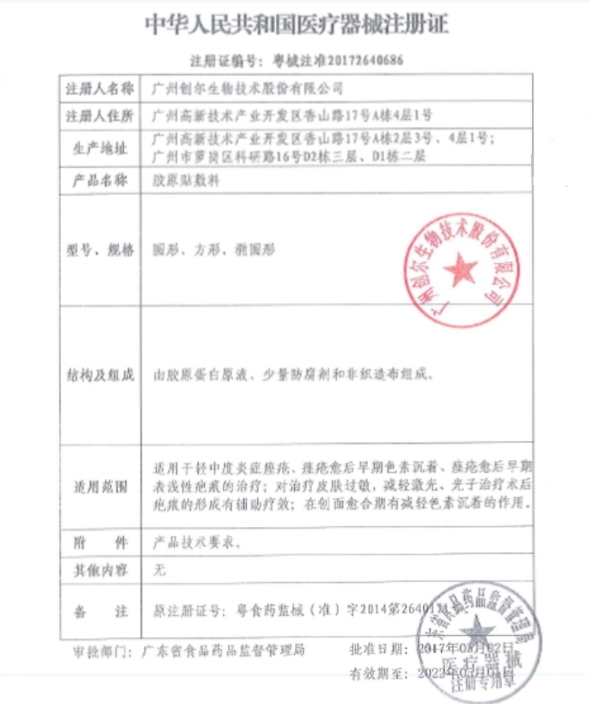 粵械注準(zhǔn)20172140686/廣州創(chuàng)爾生物技術(shù)股份有限公司 有效期至:2026-06-21膠原貼敷料