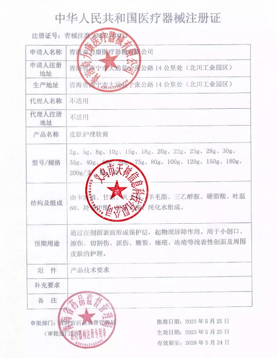 黑械注準(zhǔn)20242140026/大慶華泰生物制藥有限公司 有效期至:2029-03-25皮膚護(hù)理軟膏