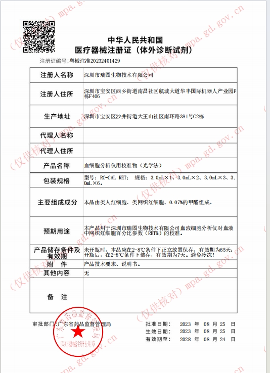 粵械注準20232400699/深圳市瑞圖生物技術(shù)有限公司 有效期至:2028-04-23血細胞分析儀用校準物(光學(xué)法)