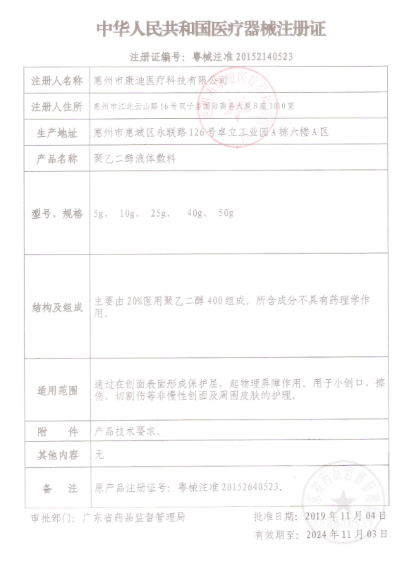 粵械注準20152640523/惠州市康迪醫(yī)療科技有限公司 有效期至:2020-06-15聚乙二醇液體敷料