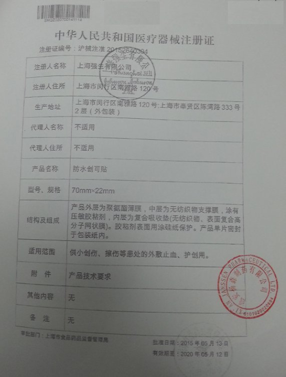 滬食藥監(jiān)械(準(zhǔn))字2010第1641305號/上海強生有限公司 有效期至:2014-11-23防水創(chuàng)可貼