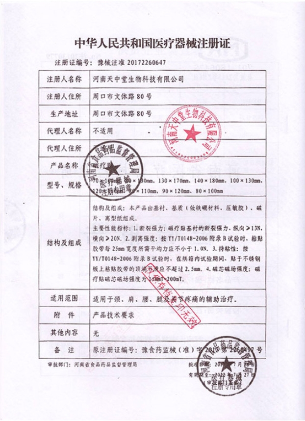 豫食藥監(jiān)械(準(zhǔn))字2013第2260497號(hào)/河南天中堂生物科技有限公司 有效期至:2017-12-08磁療貼