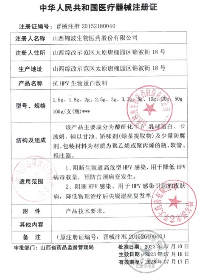 晉械注準(zhǔn)20152640040/山西錦波生物醫(yī)藥股份有限公司 有效期至:2020-08-19抗HPV生物蛋白敷料