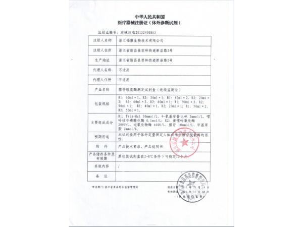 浙械注準(zhǔn)20162400274/嘉興博泰生物科技發(fā)展有限公司 有效期至:2021-05-11腺苷脫氨酶測(cè)定試劑盒(連續(xù)監(jiān)測(cè)法)