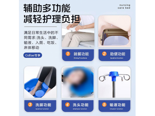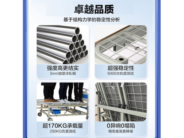 由床面部分、床架部分、控制部分(手搖)和配件(床欄、輸液架、餐桌板、便盆)組成。床面部分可在最大折起角度范圍內(nèi)任意調(diào)節(jié),或呈板狀無法調(diào)節(jié)。無源產(chǎn)品。