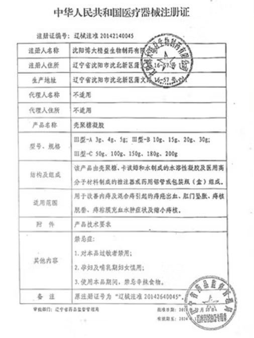 遼械注準(zhǔn)20162140042/沈陽博大精益生物制藥有限公司 有效期至:2026-02-01殼聚糖凝膠