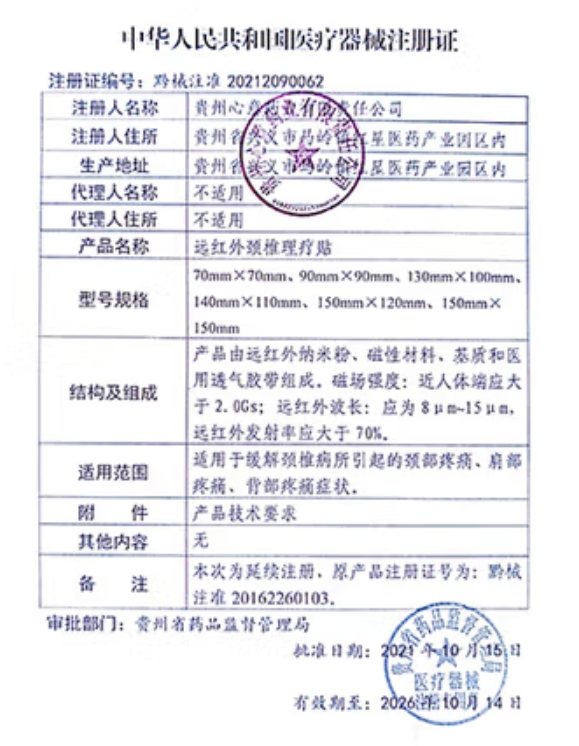 黔械注準(zhǔn)20162260103/貴州心意藥業(yè)有限責(zé)任公司 有效期至:2021-11-29遠(yuǎn)紅外頸椎理療貼