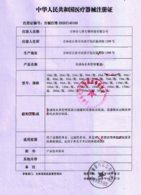 吉械注準20222140620/岐伯醫(yī)藥(吉林)有限公司 有效期至:2027-08-17高滲海水鼻腔噴霧器