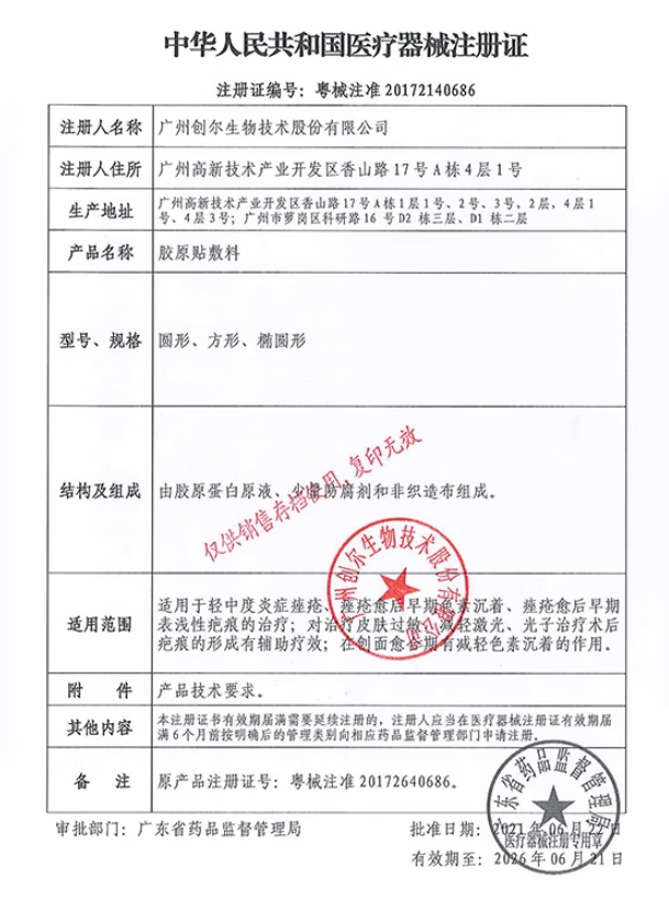粵械注準(zhǔn)20172640686/廣州創(chuàng)爾生物技術(shù)股份有限公司 有效期至:2026-06-21膠原貼敷料