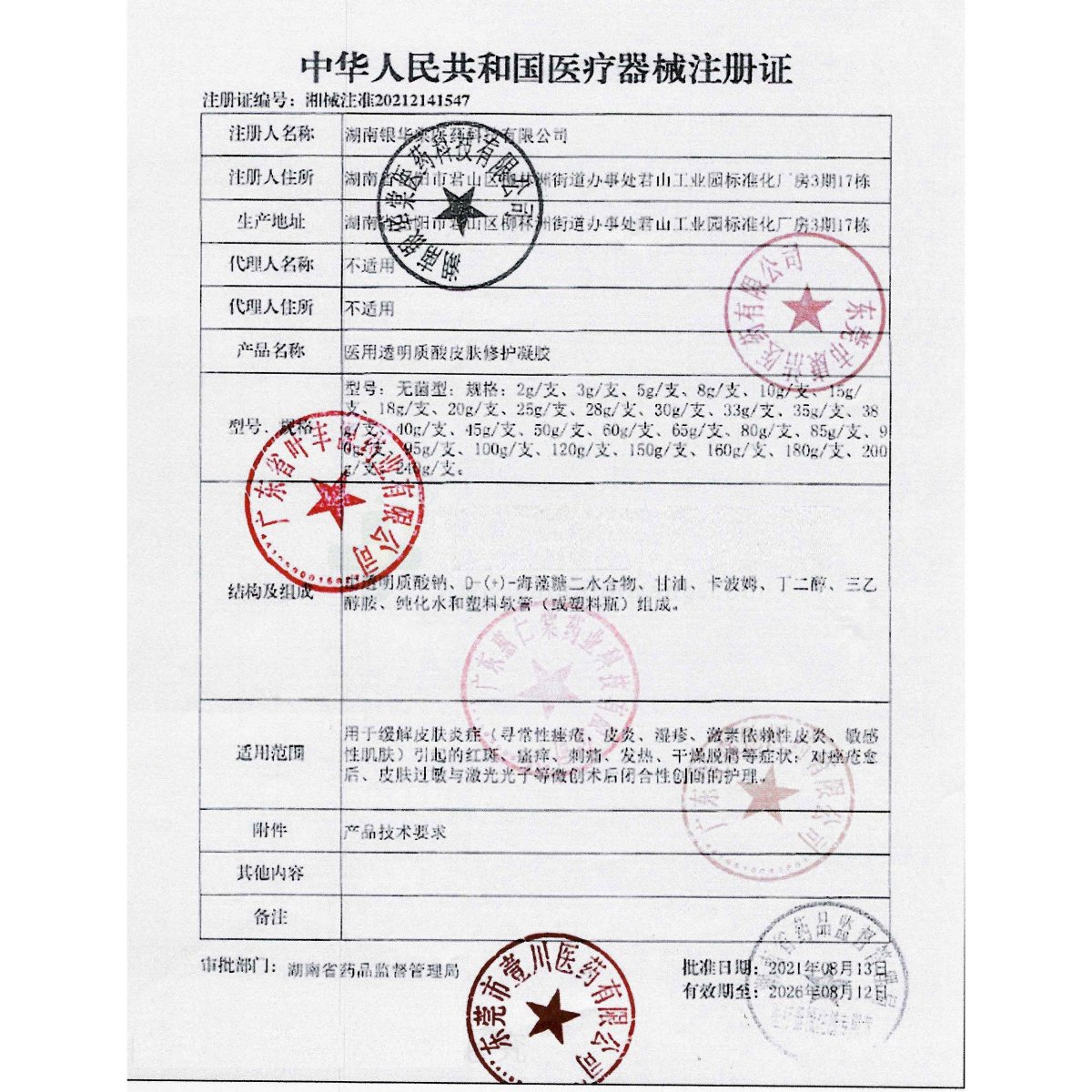 變更時間:2022-01-07n變更內(nèi)容:1、變更注冊證載明的型號規(guī)格,變更為“型號:無菌型;規(guī)格:n1g、1.5g、2g、2.5g、3g、3.5g、4g、5g、6g、7g、8g、10g、15g、18g、20g、25g、28g、30g、33g、35g、38g、40g、45g、50g、55g、60g、65g、70g、75g、80g、85g、90g、95g、100g、120g、150g、160g、180g、200g、240g/支(瓶、袋)?!眓2、變更注冊證的結(jié)構(gòu)及組成,變更為“由透明質(zhì)酸鈉、D-(+)-海藻糖二水合物、甘油、卡波姆、丁二醇、三乙醇胺、純化水和塑料軟管(或塑料瓶、玻璃瓶、鋁瓶、鋁塑膜袋)組成。”