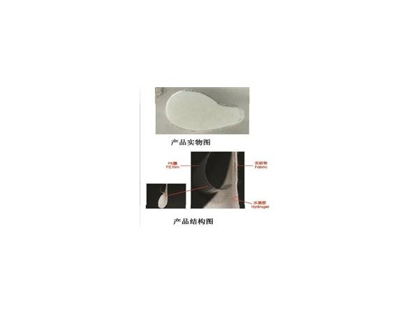 產(chǎn)品由支撐層、水凝膠層和隔離層組成。支撐層為無(wú)紡布或復(fù)合無(wú)紡布;水凝膠層為由醫(yī)用純化水、卡波姆、聚丙烯酸鈉、甘油、甘羥鋁組成親水高分子凝膠;隔離層為聚乙烯膜。