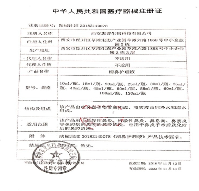 陜食藥監(jiān)械(準)字2014第2640017號/西安惠普生物科技有限公司 有效期至:2020-02-09清鼻護理液