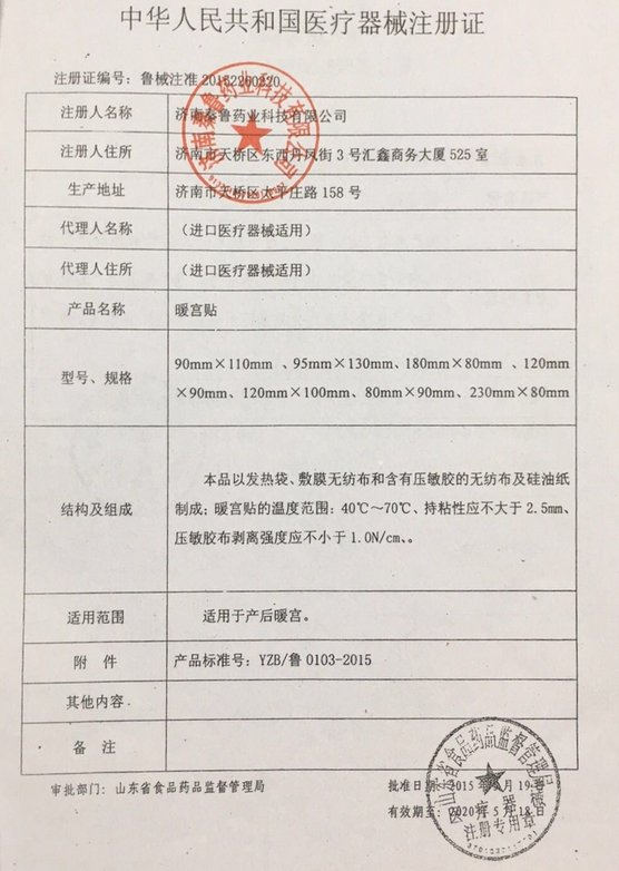 魯械注準(zhǔn)20152090320/濟(jì)南秦魯藥業(yè)科技有限公司 有效期至:2025-04-05暖宮貼