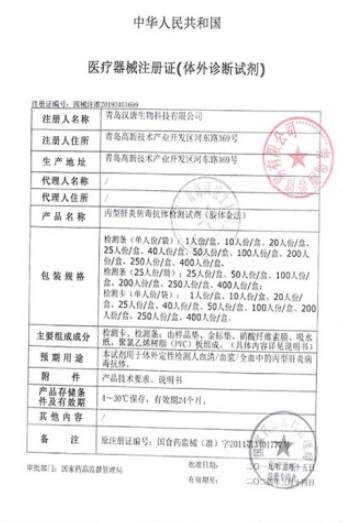 國(guó)械注準(zhǔn)20143401951/艾博生物醫(yī)藥(杭州)有限公司 有效期至:2024-03-19丙型肝炎病毒抗體檢測(cè)試劑(膠體金法)
