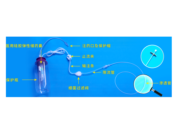一次性使用術(shù)后局部麻醉鎮(zhèn)痛系統(tǒng)的結(jié)構(gòu)構(gòu)造分為三個(gè)部分:(1)輸注泵(儲液囊、加藥單向閥、輸液管路、藥液過濾器、止流閥、限流管組成);(2)滲透導(dǎo)管(導(dǎo)管、延長管及管座組成);(3)滲透導(dǎo)管導(dǎo)引鞘(可撕外鞘及穿刺針組成)。