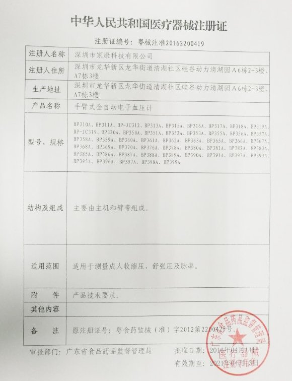 粵食藥監(jiān)械(準(zhǔn))字2012第2200425號/深圳市家康科技有限公司 有效期至:2016-07-01手臂式全自動電子血壓計(jì)