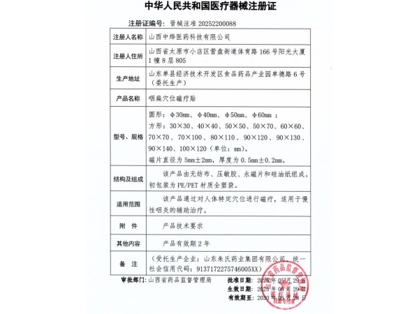 晉械注準(zhǔn)20242200101/山西康必健醫(yī)藥集團(tuán)有限公司 有效期至:2029-06-11咽扁穴位磁療貼
