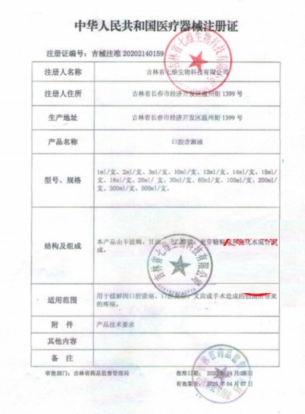 吉械注準(zhǔn)20222170640/岐伯醫(yī)藥(吉林)有限公司 有效期至:2027-08-18口腔含漱液
