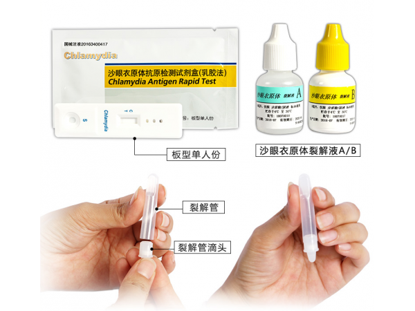 試劑:包被用衣原體抗體、標記用衣原體抗體、鏈霉親和素結(jié)合物、生物素、乳膠、硝酸纖維素膜、聚酯纖維膜;裂解管;裂解管滴頭;裂解液A;裂解液B。(具體內(nèi)容詳見產(chǎn)品說明書)