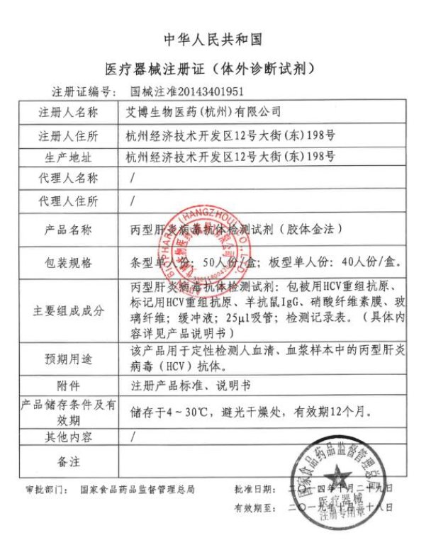 國械注準20163401256/杭州博拓生物科技股份有限公司 有效期至:2026-04-22丙型肝炎病毒抗體檢測試劑(膠體金法)