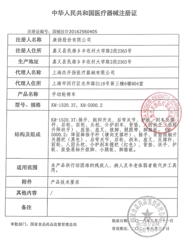 國械注許20152560122/上海杰開揚醫(yī)療器械有限公司 有效期至:2019-08-10手動輪椅車