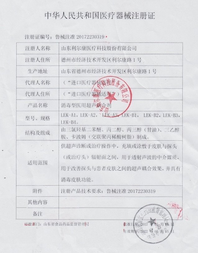 鄂械注準20162232407/湖北穆蘭同大科技有限公司 有效期至:2021-08-17消毒型醫(yī)用超聲耦合劑