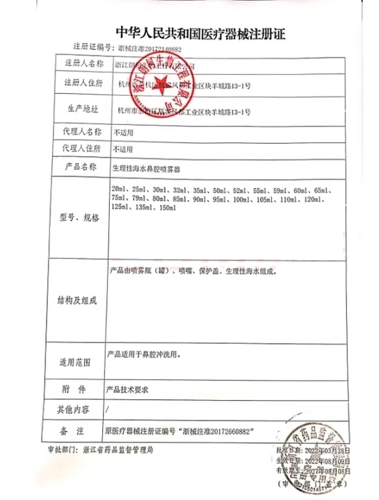 浙械注準(zhǔn)20172660882/浙江朗柯生物工程有限公司 有效期至:2022-08-08生理性海水鼻腔噴霧器