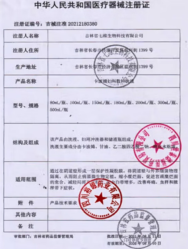 吉械注準20222180072/吉林省達達醫(yī)藥生物有限公司 有效期至:2027-02-09卡波姆婦科液體敷料