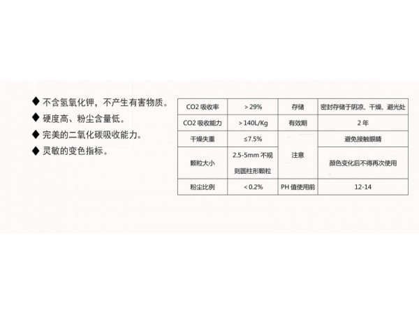 二氧化碳吸收劑是由氫氧化鈣、水、氯化鈣、指示劑組成的一種疏松多孔,具有高吸收性的圓柱形條狀顆粒。吸收二氧化碳后由粉紅色變成灰白色或由白色變成紫色。
