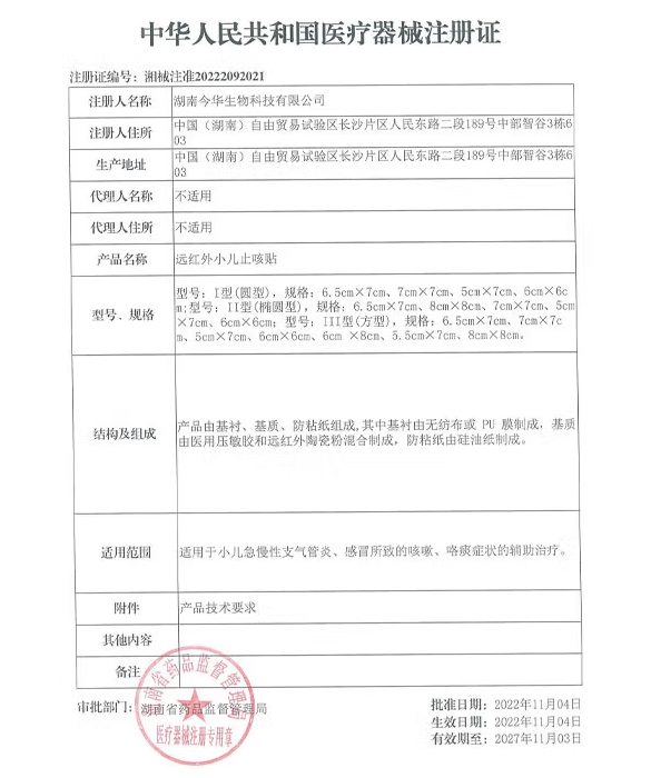 吉械注準20252090184/中科國太(吉林)藥業(yè)有限公司 有效期至:2030-03-26遠紅外小兒止咳貼