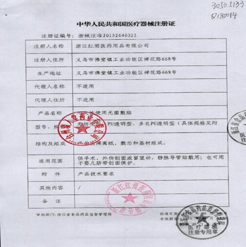 瓊械注準20152640016/??诘畚轴t(yī)藥用品有限公司 有效期至:2020-06-08一次性使用無菌敷貼