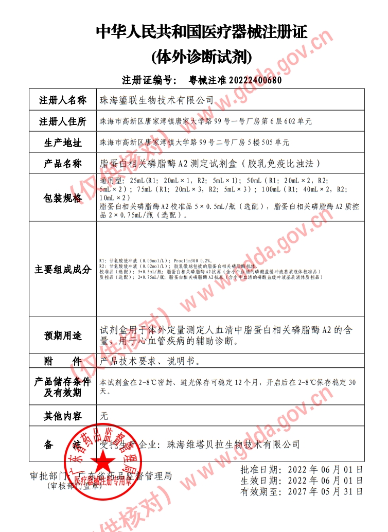 粵械注準20232401444/廣州達泰生物工程技術有限公司 有效期至:2028-08-27脂蛋白相關磷脂酶A2測定試劑盒(膠乳免疫比濁法)