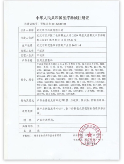鄂食藥監(jiān)械(準(zhǔn))字2013第2641448號/武漢華衛(wèi)科技有限公司 有效期至:2017-09-25醫(yī)用無菌敷料